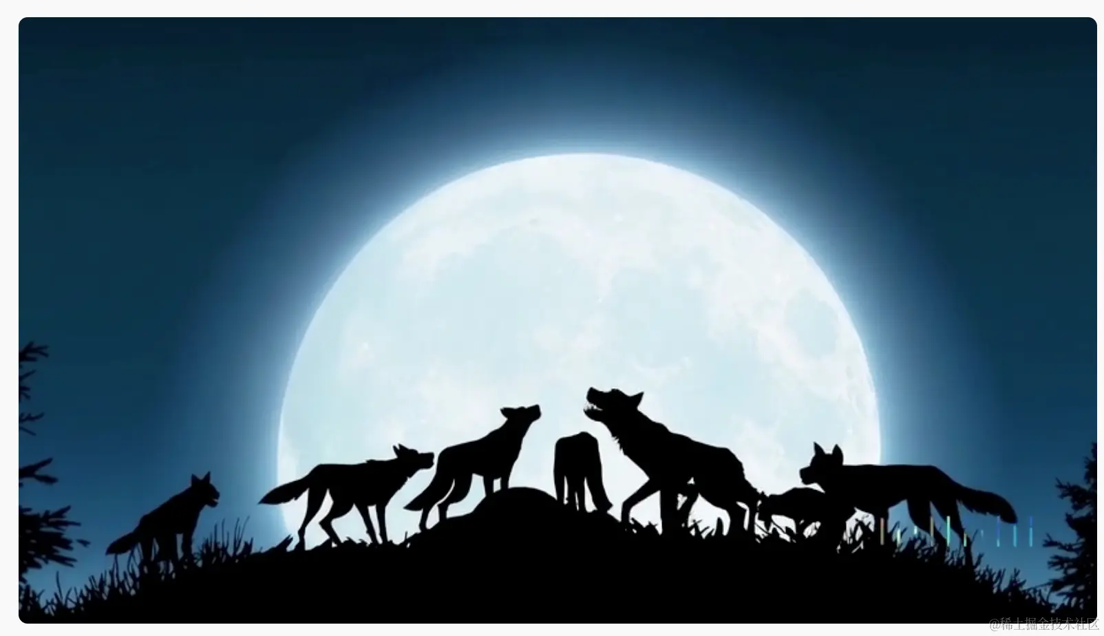 提示:一个美丽的剪影动画展示了一只狼对着月亮嚎叫,感到孤独,直到它找到狼群。