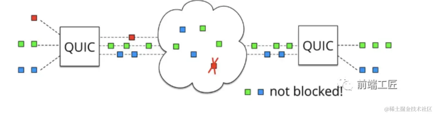 为了解决 HTTP/2 的缺陷,Google 推出了基于 UDP 协议的 QUIC 协议,通过在 UDP (弃用 TCP)上建立连接,使用多个独立的数据流来实现更好的并行传输。这使得队头阻塞问题得以解决,因为一个数据流的阻塞不会影响其他数据流的传输。