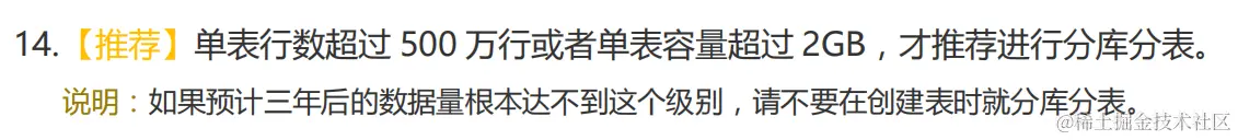 《阿里巴巴Java开发手册》上也说了,如果单表数据量超过 500 万或 2GB 时就建议分库分表了,如下图所示: