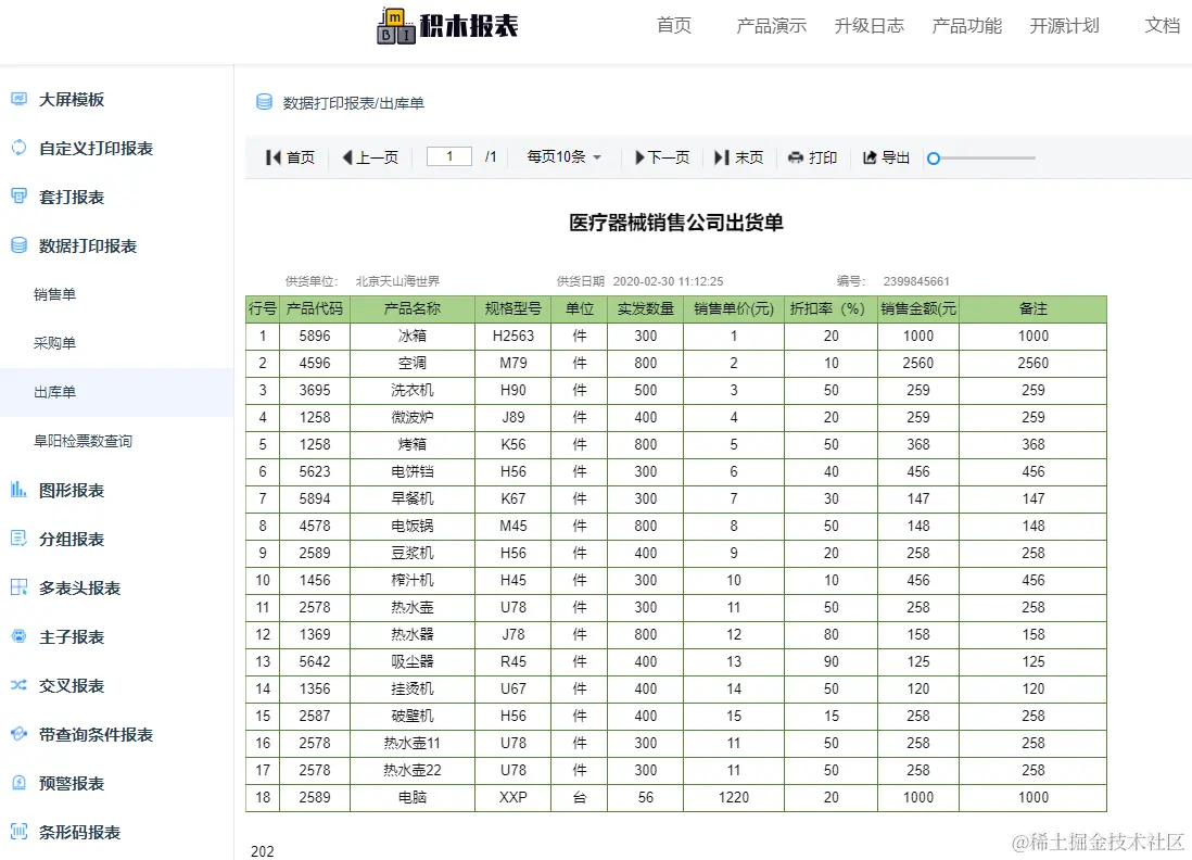 - 可设计各种类型的单据、大屏,如出入库单、销售单、财务报表、合同、监控大屏、旅游数据大屏等