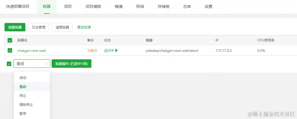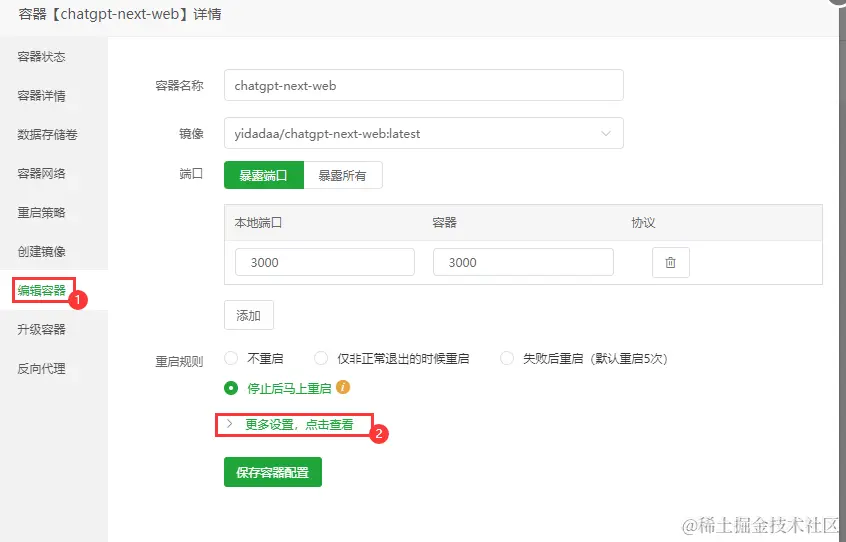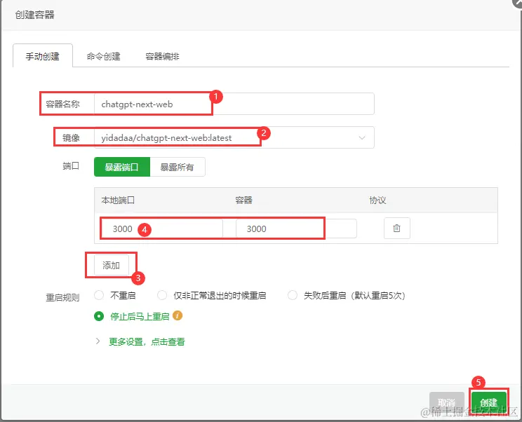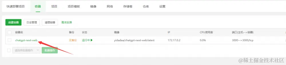 容器名称任意输入,我这里输入的chatgpt-next-web,镜像选择刚刚拉取的yidadaa/chatgpt-next-web:latest