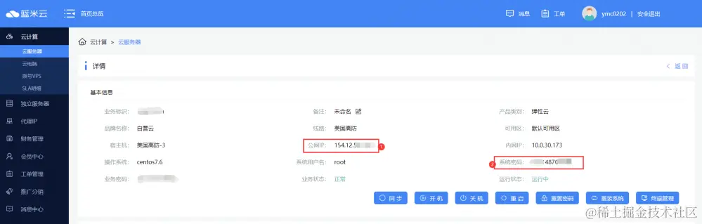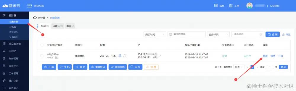 2、购买完成后,进入蓝米云控制台-云计算-云服务器,找到你的服务器,点击右侧的管理
