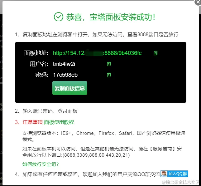 4、等待安装完成后,会显示面板地址、用户名、密码,请务必保存好,后续管理服务器需要用到。
