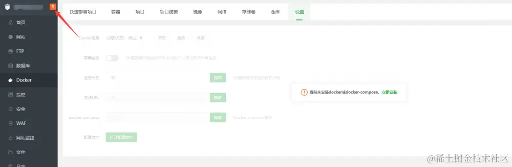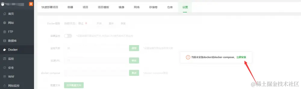5、点击宝塔面板左侧的docker,第一次打开会提示安装docker,我们点击立即安装。