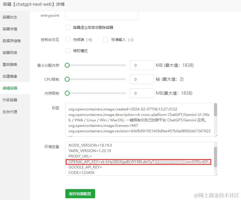 当然这里我们是自己使用,如果每次使用都来输入OpenAI API key的话就不是特别友好了,所以我们可以在容器中直接内置一个OpenAI API key,这样就不需要每次访客使用就需要输入了。