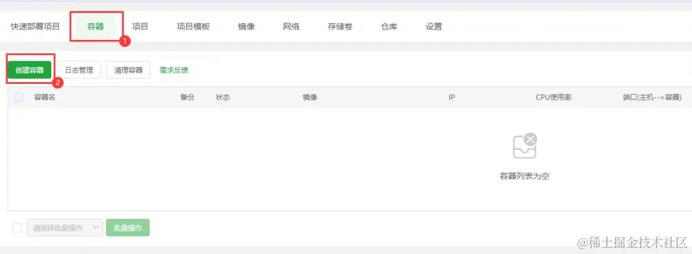 等待拉取完镜像后,再点击顶部的容器-创建容器