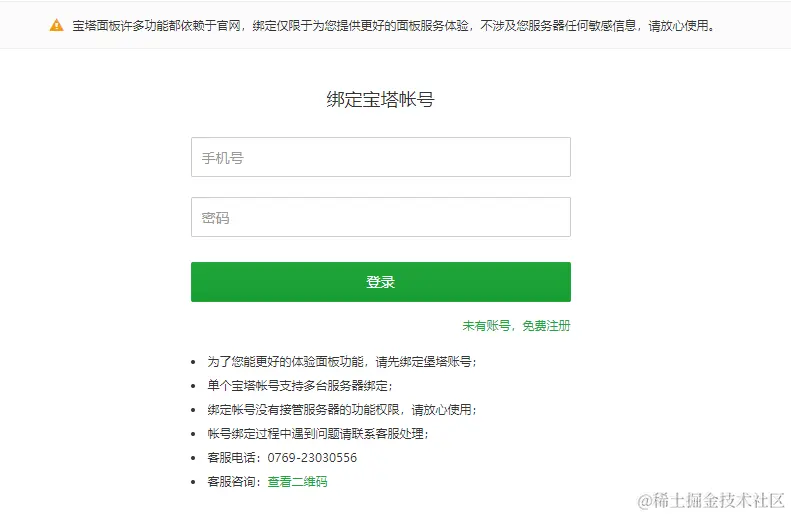 登录面板后,首次会提示绑定宝塔账号,这里的宝塔账号不是刚刚的面板账号,而是宝塔官方的账号,如果你没有的话,点击下面的免费注册,注册一个账号,再进行绑定就可以了。