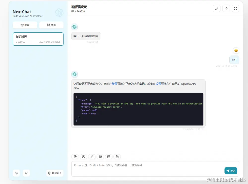 7、搭建ChatGPT现在已经完成了,访问:http://你的公网IP:3000 就可以看到已经出现了ChatGPT的界面,但是发送内容会提示输入密码或设置OpenAI API key