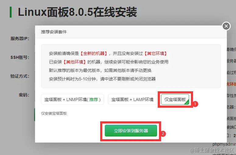 然后会弹出一个信息框,这里我们选择仅宝塔面板,然后再点击立即安装到服务器