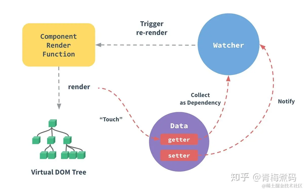 - 写入数据时触发 set 方法,从而借助 dep 发布通知,进而 watcher 进行更新