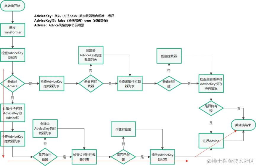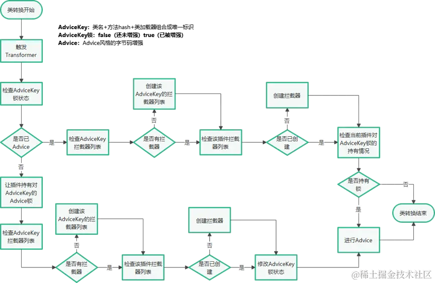 基于字节码增强锁,在转换器触发时,主要有两条路径可以走,类文件转换器会通过目标方法的AdviceKey ( 类名+ 方法hash+ 类加载器组成的一个唯一表示,用于表示字节码增强的目标) 来检查其所关联的锁,判断当前目标方法是否已被Sermant进行过字节码增强(织入拦截器调度的切面):