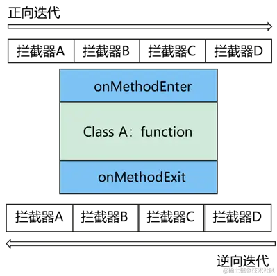 Sermant的设计中,通过字节码增强引入的服务治理能力,是通过在目标方法上添加服务治理功能切面来完成的,每一个服务治理插件,通过一系列切面的配合来达成最终的服务治理效果。不同的服务治理功能,可能会对同一个目标方法进行处理。但并不会对同一个方法进行多次字节码增强,而是通过一次字节码增强织入调度切面(onMethodEnter、onMethodExit等),通过该切面对相关的服务治理能力(通过拦截器实现,每一个切面会对应一个拦截器的列表)进行调度: