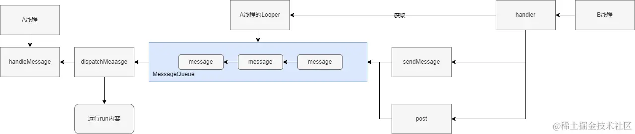 如果想从B线程发送信息到A线程,B线程需要获取到A线程的Looper,然后实例化handler,构造参数就是A线程的Looper。如果需要发送信息,可以通过handler的sendMessage方法发送一个Message,也可以通过handler的post方法发送一个runnable类型,这些内容会包装成一个Message对象,并加入到MessageQueue消息队列中。