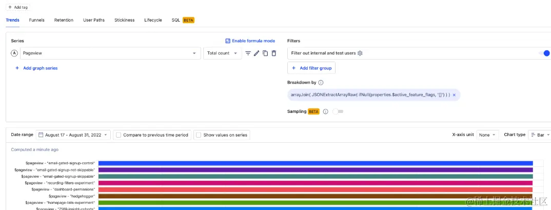 分布分析可以帮助数据分析师、研究人员和决策者理解数据的内在结构,为进一步的数据分析和决策提供基础。例如,在市场研究中,分布分析可以帮助了解消费者行为的多样性;在质量控制中,分布分析可以用来检测生产过程中的异常。PostHog是轻松的利用breakdown by来实现分布分析: