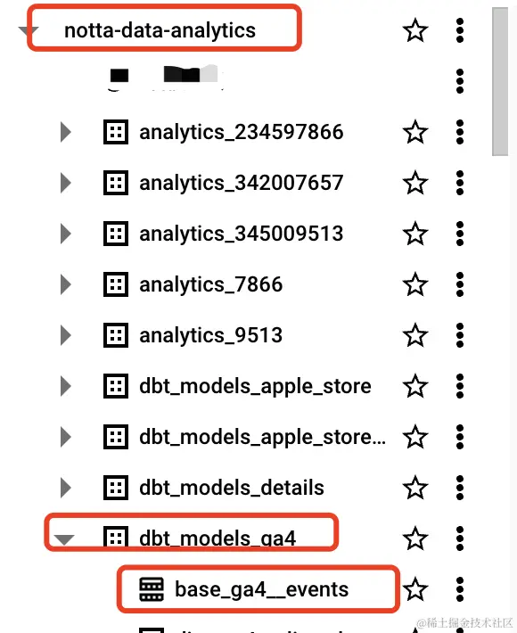但事实上并不是所有的数据源查询都适合做增量表,为了方便大家理解,这里我直接以 GA 作为例子,GA 是 Google 做用户埋点行为分析的工具,如果我们提前添加了埋点,那么比如用户的点击行为,停留时间等等都能通过埋点事件上报到 GA 平台,而 GA 数据又能直接同步到 bigquery 作为数据源,这里给大家展示下 GA 的源数据,可以很清晰的看到它们都是时间分片表: