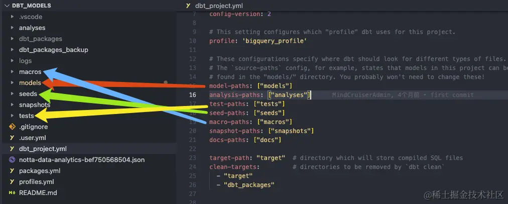 model-paths 下面的几个字段同理,都是在告诉 dbt 不同功能文件所在的目录地址,如果某个目录你不要,那么对应的配置你可以删除。