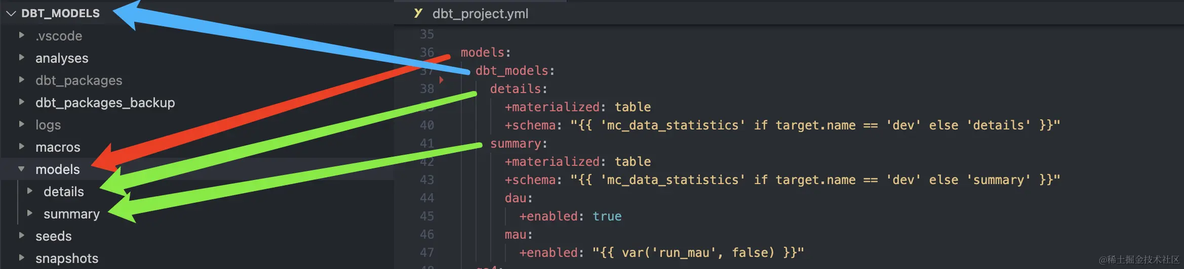 我们其实是在定义 models 相关的配置,同时指定了是为 dbt_models 这个项目做 model 的配置,然后我们为 models 下两个不同的文件夹 details 和 summary 下的 model 定义了不同的配置。