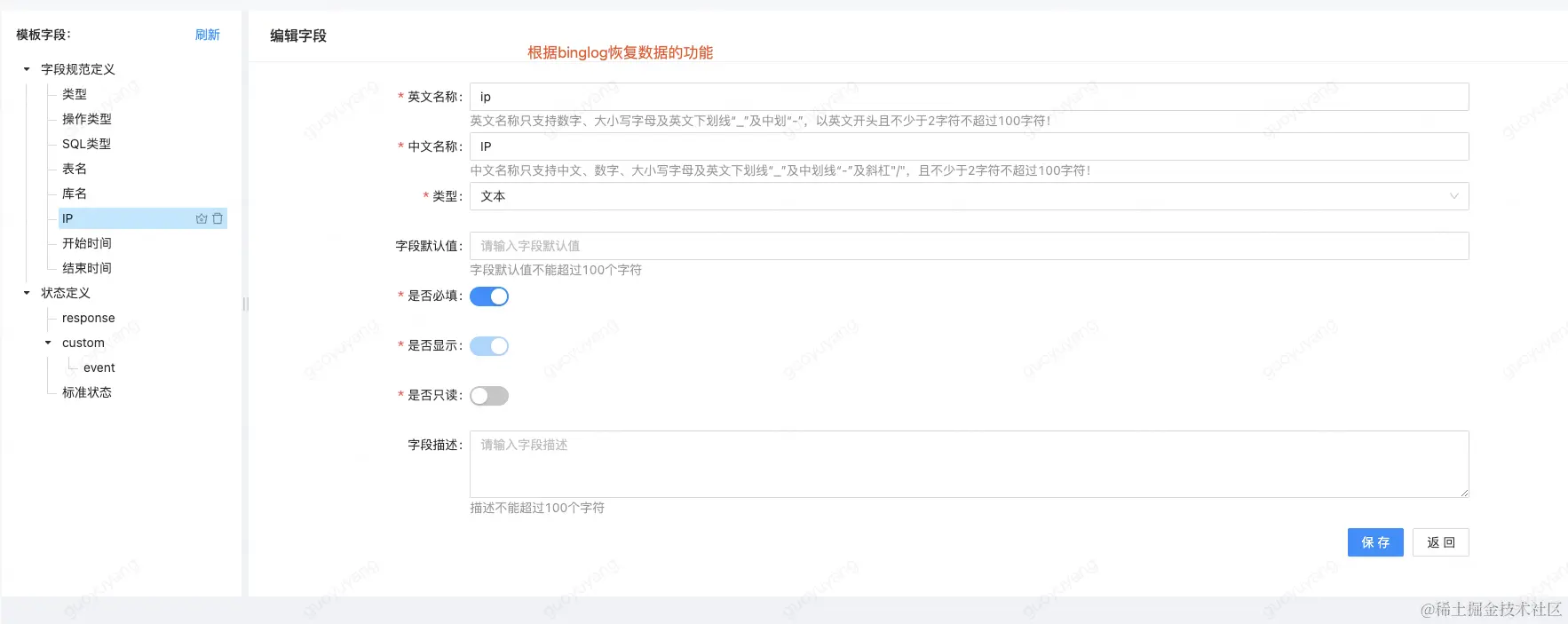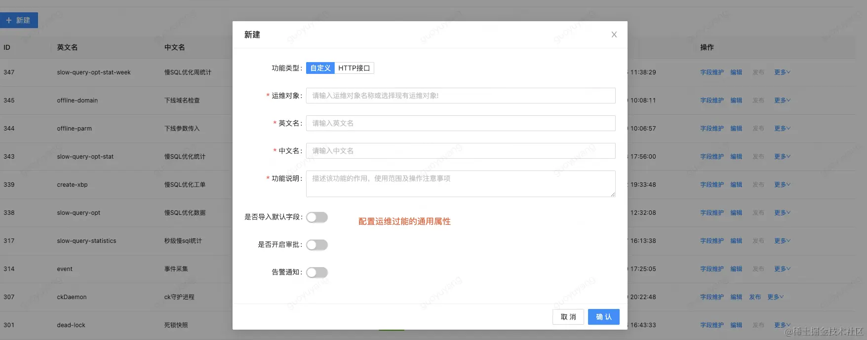 ②上面步骤"确认"后,会在列表页出现对应名称的运维原子记录,点击操作栏里的“字段维护”按钮开始配置描述该运维功能的具体数据结构。