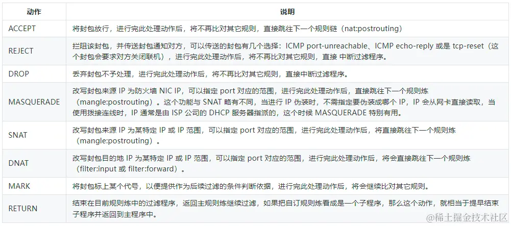动作:可以是拒绝、接受、丢弃等;详细介绍见下表