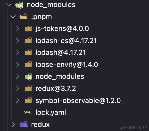 它生成的 node_modules 目录如下:直接依赖放在根目录,依赖的依赖放在 .pnpm 文件夹内
