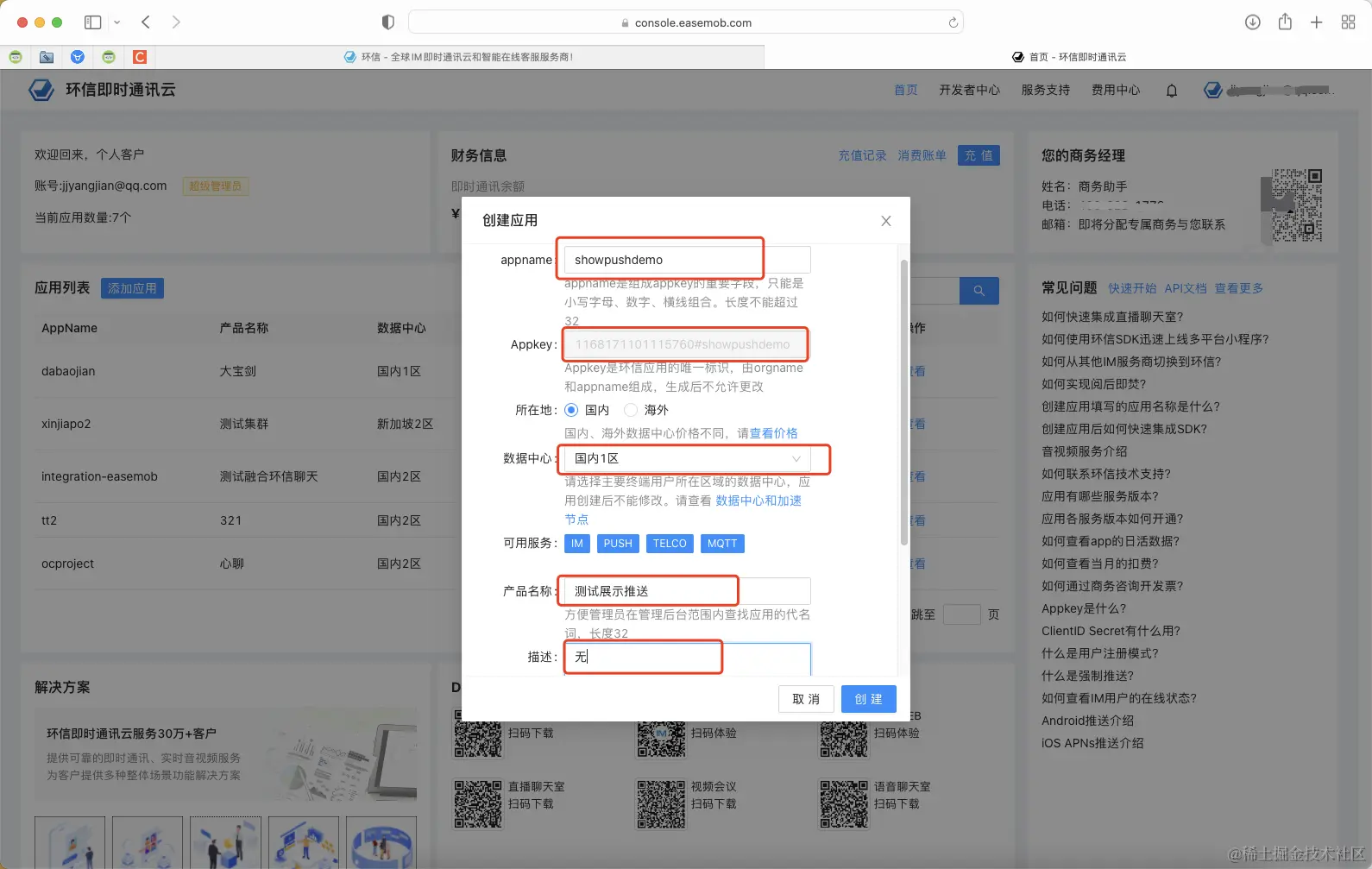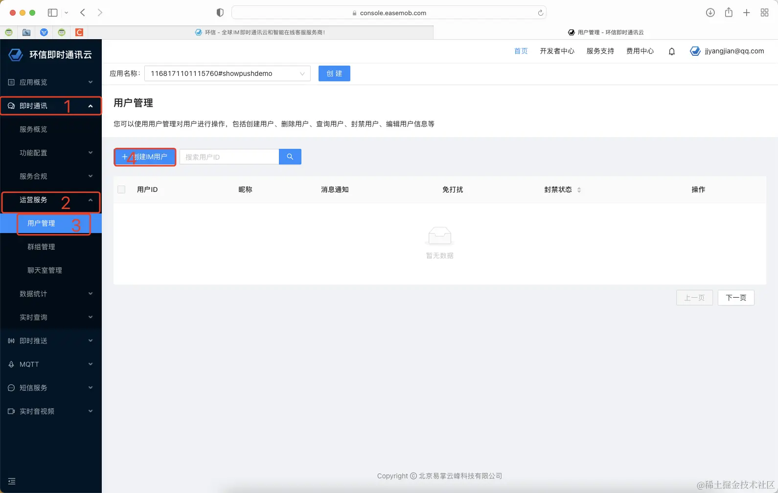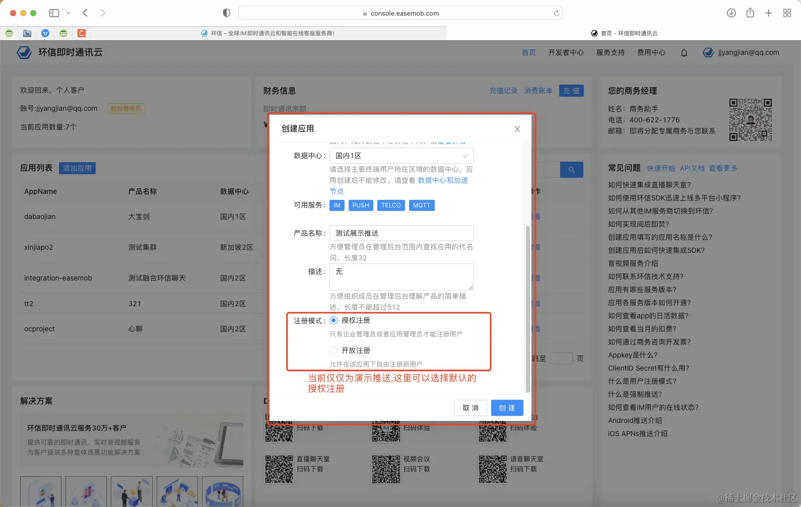 (注册地址:环信即时通讯云)