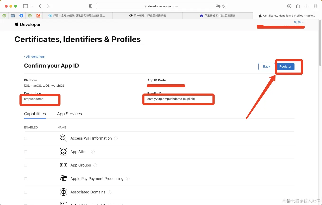 在苹果开发者中心创建项目,注册推送证书.