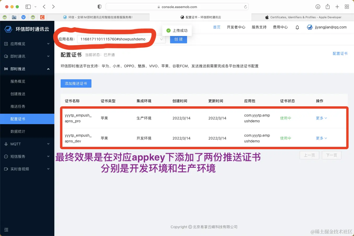 注意!!!是在刚才创建的appkey( 1168171101115760#showpushdemo )下创建证书!!!