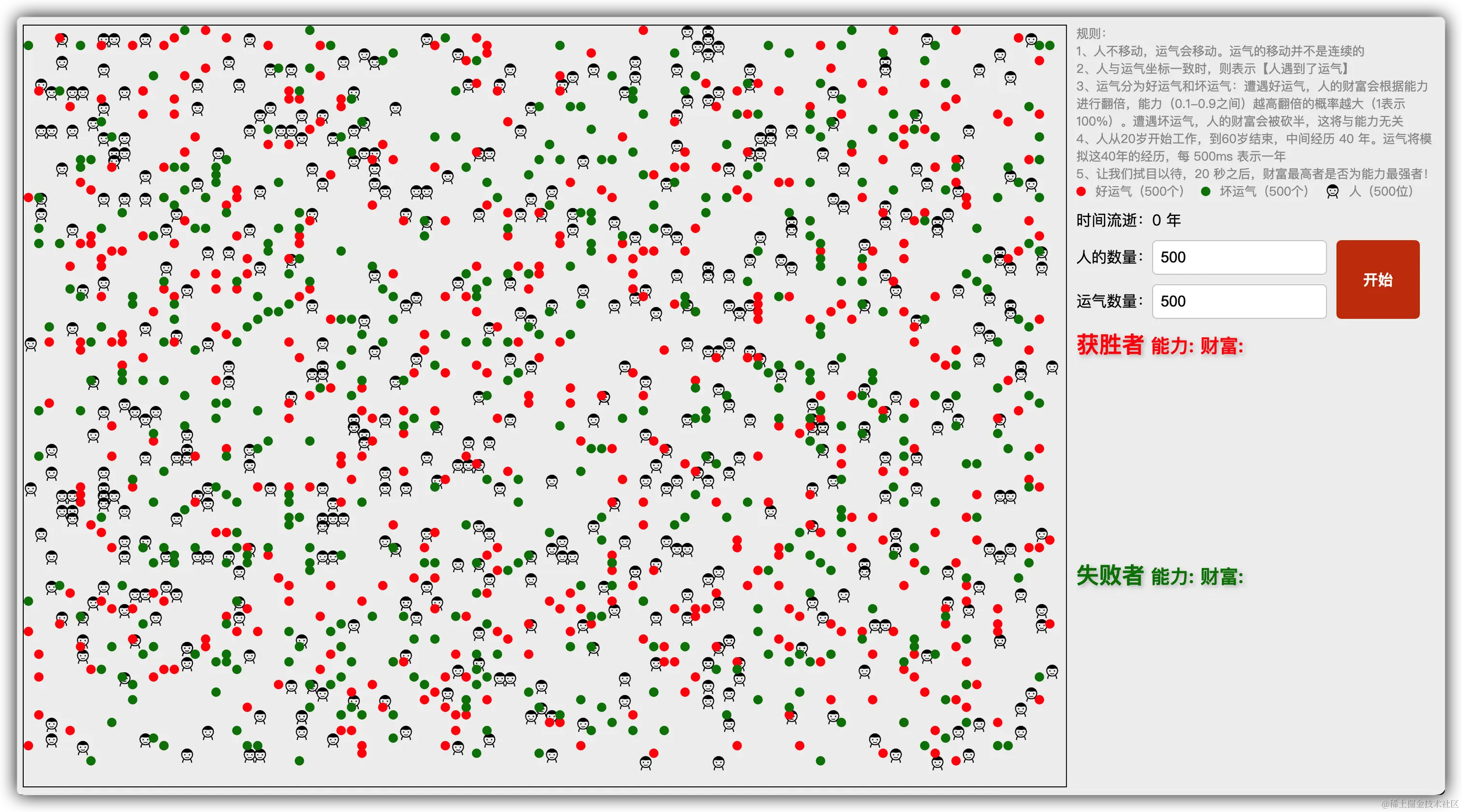 - 红点表示好运气,用 绿点表示坏运气,用 人头表示人,人的数量与运气的数量都可以修改。