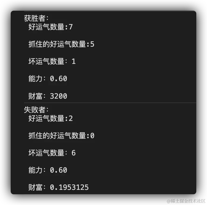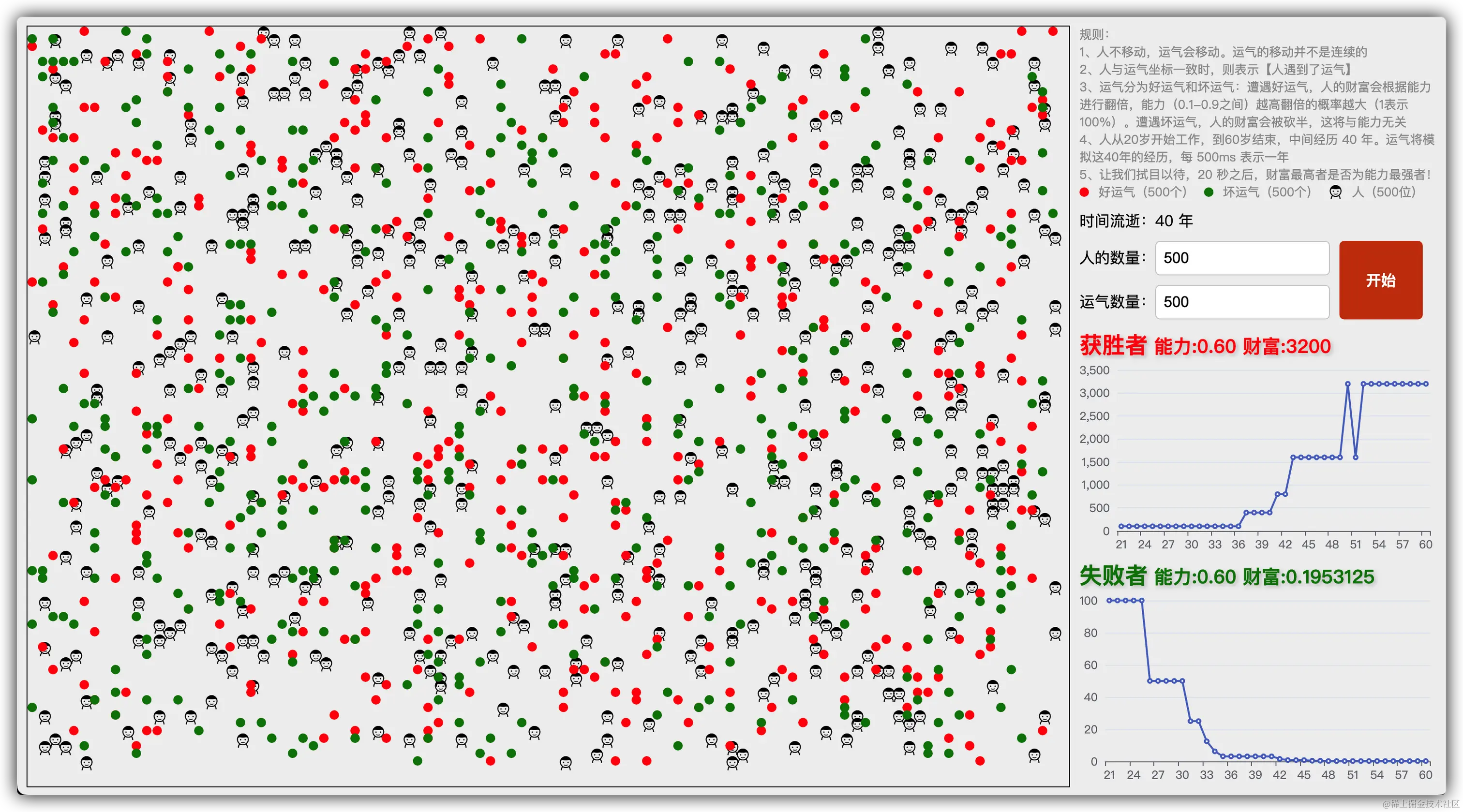 - 运气分为好运气和坏运气:遭遇好运气,人的财富会根据能力进行翻倍,能力(0.3-0.9之间)越高翻倍的概率越大(1表示100%)。遭遇坏运气,人的财富会被砍半,这就和能力没有关系了