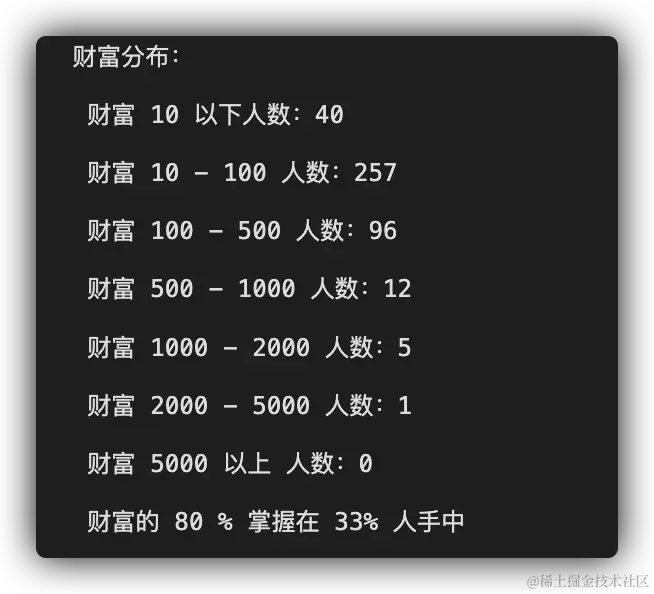 这是几乎完美符合 二八法则 的,也就是 80%的财富会掌握在20%的人手中