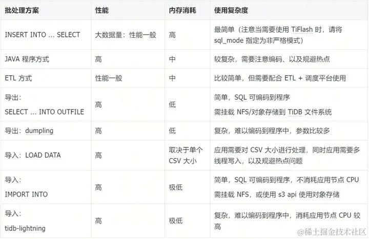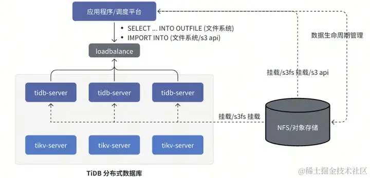 TiDB 7.5.0 引入的 IMPORT INTO 功能,结合 SELECT ... INTO OUTFILE、以及 NFS/对象存储,让 TiDB 上增加了一种更加简单且非常高效的批处理方案,JAVA 应用程序处理时更加简单,ETL 调度也更简单。