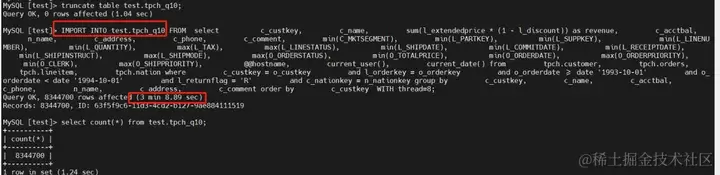 I MPORT INTO 功能当前仅支持 CSV 导入,未来 TiDB 8.x 版本中 IMPORT INTO 将直接集成 IMPORT INTO ... SELECT ... 功能,极致简化批处理操作,性能也更进一步提升(187 秒),敬请大家期待 :