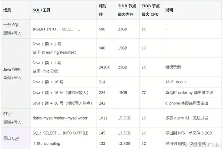 将大批量查询结果快速写入到目标表,既考验查询性能,同时也考验批量写入的性能。