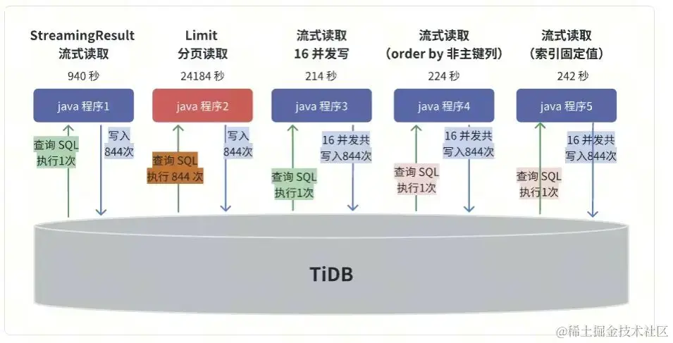 使用 JAVA 处理时,StreamingResult 流式读取+多并发写入方式能够获得非常好的性能。 强烈不建议使用 limit 分页这种形式拆批 ,这种逻辑数据库将执行 844 条查询 SQL,效率极低,消耗的资源极高。同时 StreamingResult 这种流式读取还可以使用于数据导出的场景,对比使用 limit 分页处理,效率也更高。