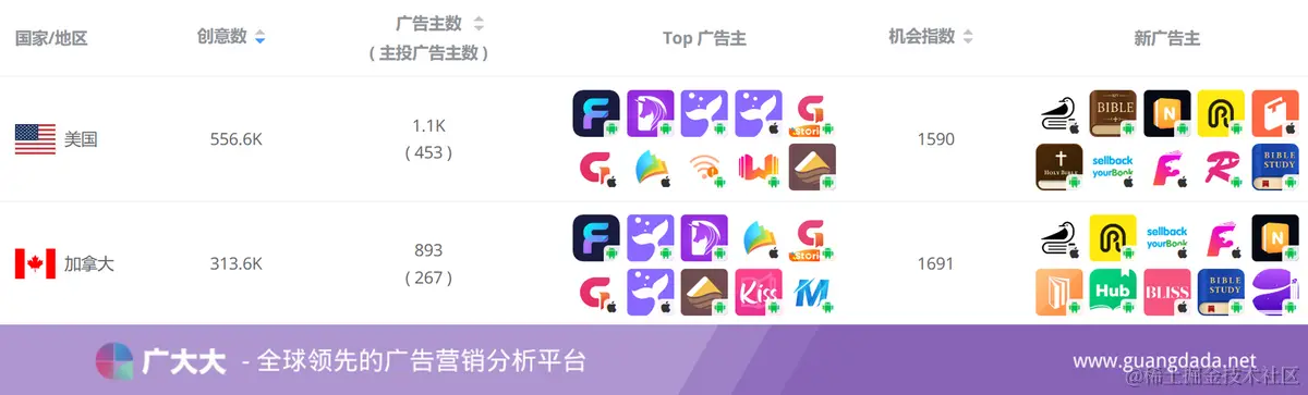 1、在美国为首的北美地区中,TOP广告主依然是前面提到的几款网文产品,其中【FicWorld】投入最多;新广告主中也是以网文产品占据多数,但圣经类产品的占比也挺大;