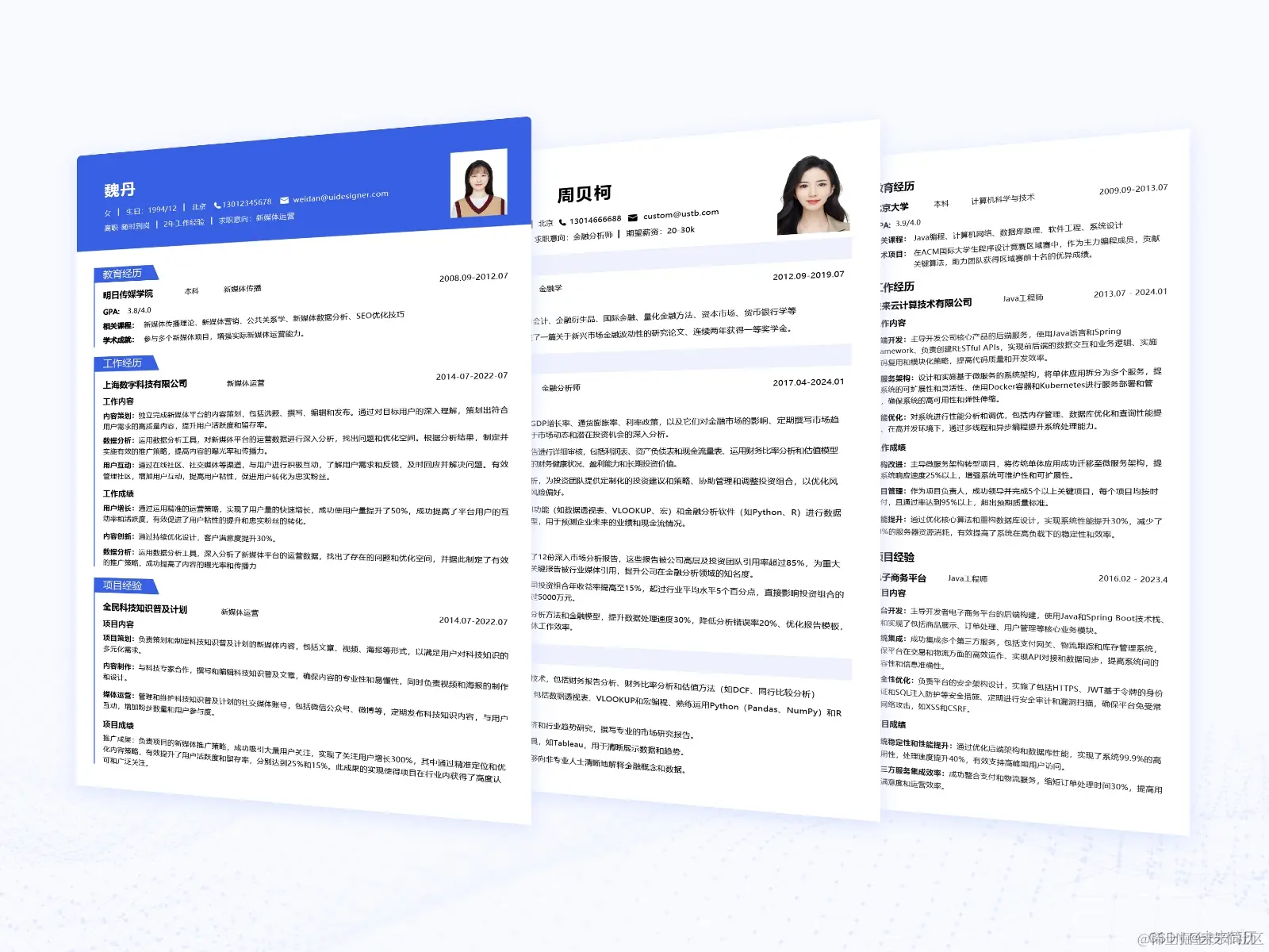 工作经历更侧重于展示求职者的整体职业背景,而项目经历则更侧重于展示求职者在具体项目中的技术能力和实际成果。在撰写简历时,应根据求职的职位要求,有针对性地展示这部分内容,以突出自己的优势。