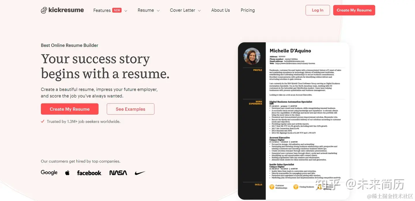 Kickresume 是用于创建简历和求职信的工具。 它为用户提供了 50 多个模板,其中包括在几分钟内创建专业简历或求职信的分步说明。