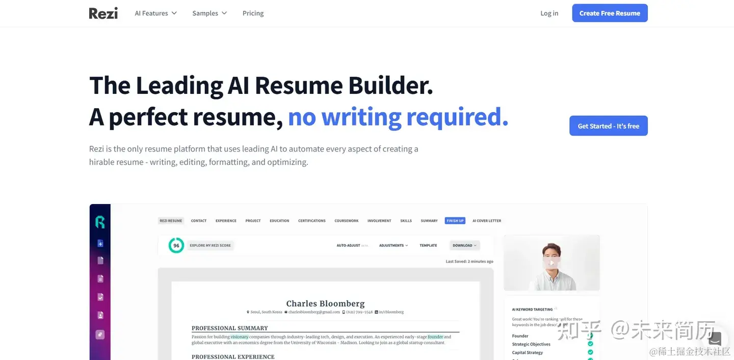 Rezi Resume Builder 几乎可以立即为您构建一份完整的简历。 在初始阶段,它会询问您的专业领域并相应地构建所有内容。