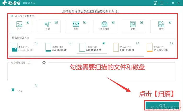 第2步:在主界面,将要扫描的文件类型和磁盘勾选完毕后,点击【扫描】;