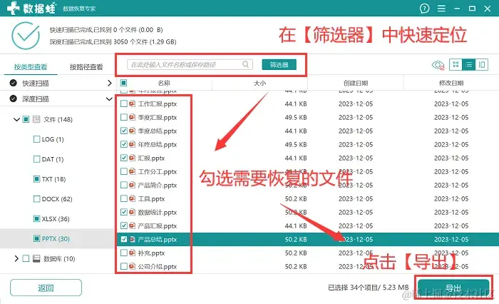 第4步:深度扫描完成后,用户可以直接对需要恢复的文件进行查看和选择,也可以在【筛选器】中快速查找文件,将需要恢复的文件都勾选上后,点击【导出】。