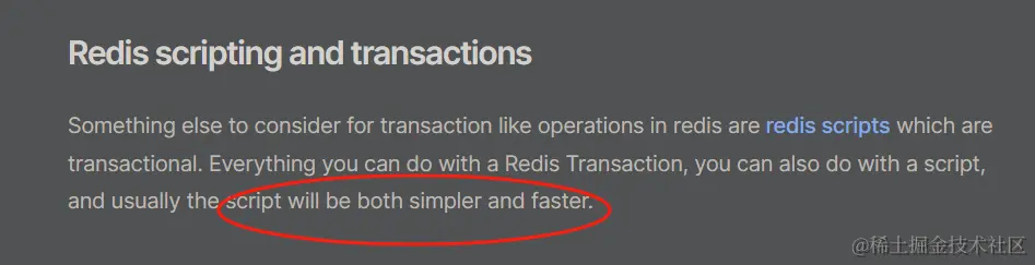 Redis官方提到在Redis中,除了使用传统的事务(通过MULTI、EXEC等命令)外,还可以通过Redis脚本来实现类似事务的操作,而且通常情况下脚本会更简单和更快,这里说的脚本就是我们常使用的Lua脚本。