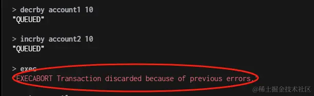 在multi执行之后exec执行之前,如果再开启一个窗口来操作account1,这时第一个窗口的事务就会执行失败,数据的值不会被改变。