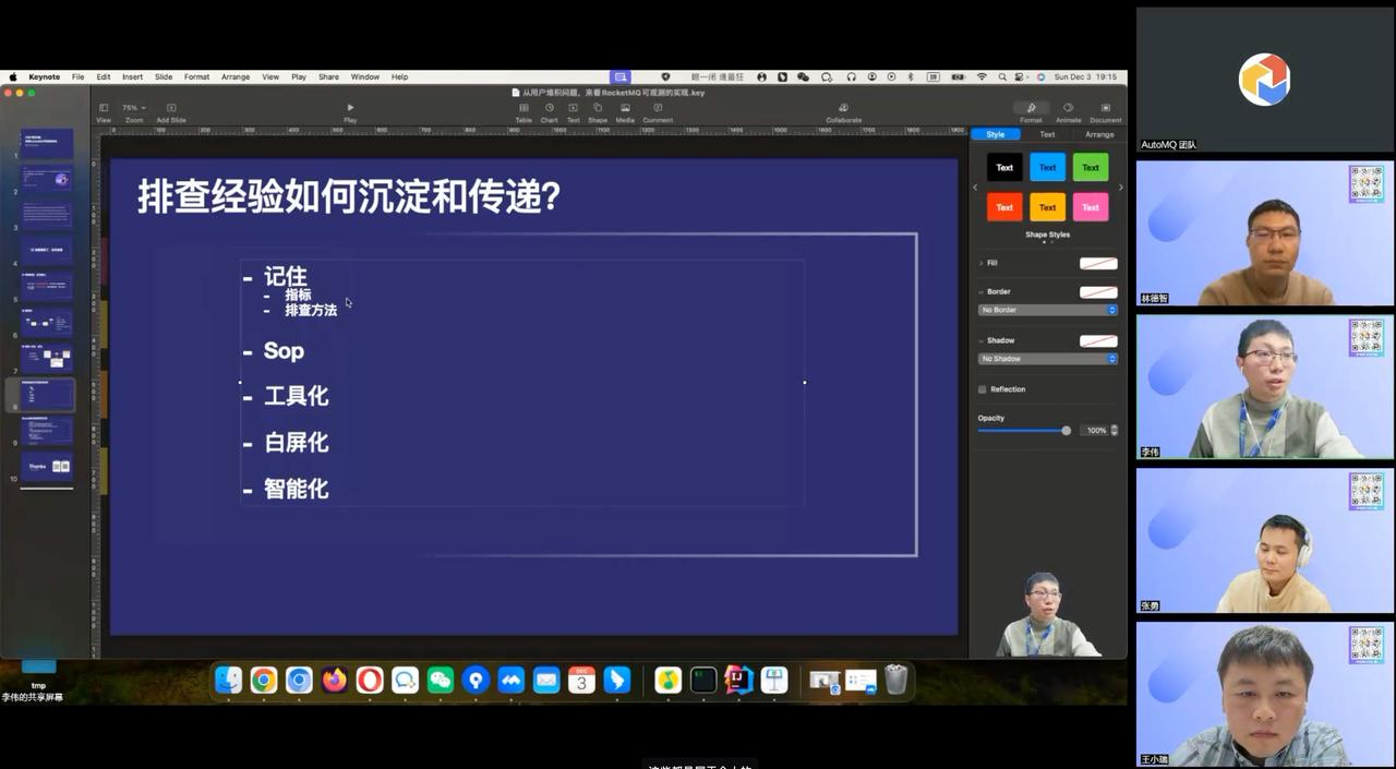 腾讯云 RocketMQ 技术专家李伟老师分享了在解决堆积问题时的经验分析方法,包括根据经验快速定位问题、利用监控指标进行分析、巡检链路的建立等。他还总结了将运维经验沉淀下来的方法,包括个人记录、标准化操作文档、工具化和页面白屏化的发展。最后,他简要介绍了RocketMQ 5 的可观测指标实现方式,并指导大家如何查找和理解这些指标。