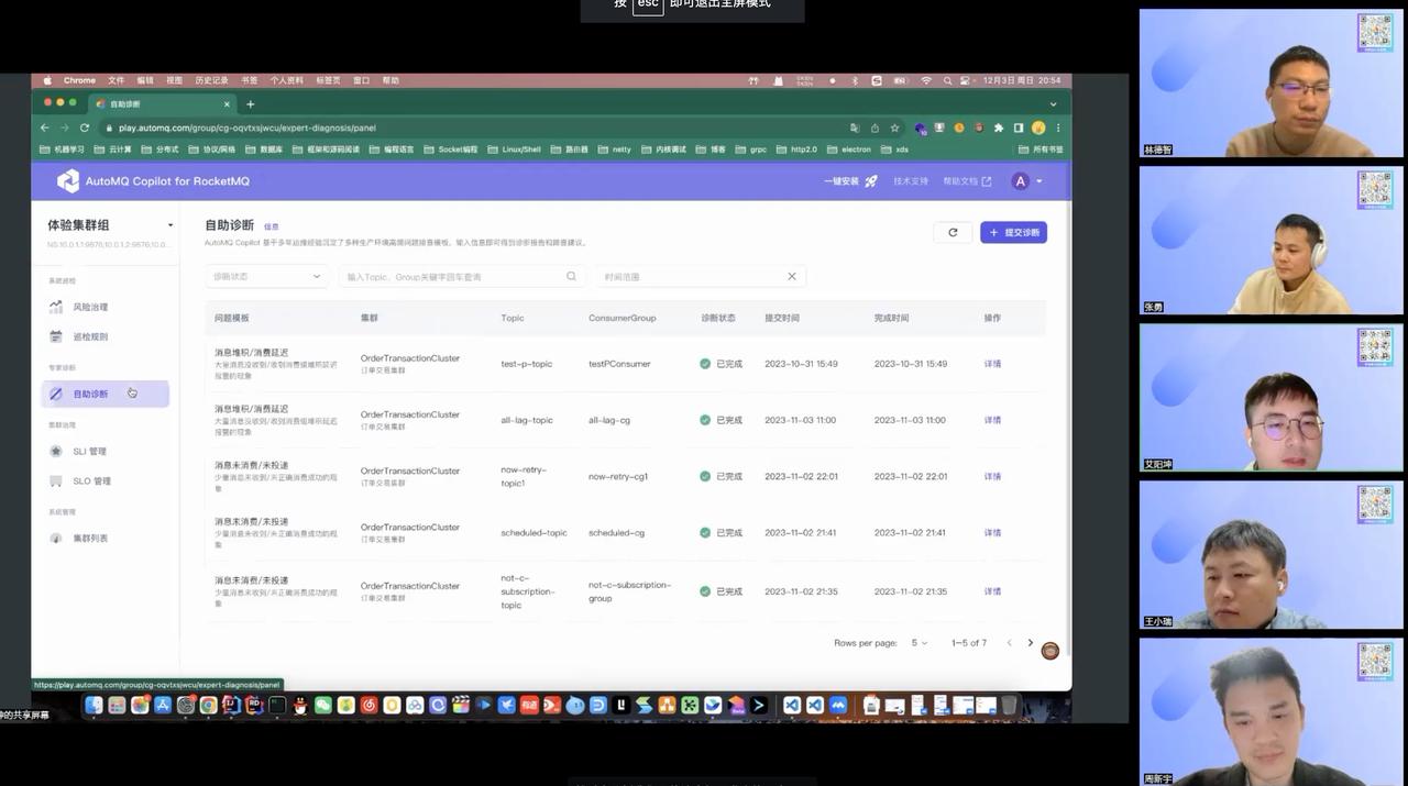Apache RocketMQ PMC Member 艾阳坤老师演示了 RocketMQ Copilot 产品的针对于消息堆积的自助诊断的过程。在周新宇老师提到的消息未消费问题上,他也使用 RocketMQ Copilot 产品的自助诊断功能进行了演示,只需要填入 Topic,ConsumerGroup 和 MessageId 等信息,RocketMQ Copilot 就可以根据这些元数据和线上信息还原现场,根据消息未消费的知识图谱依次排查,并最终定位出问题的根因。