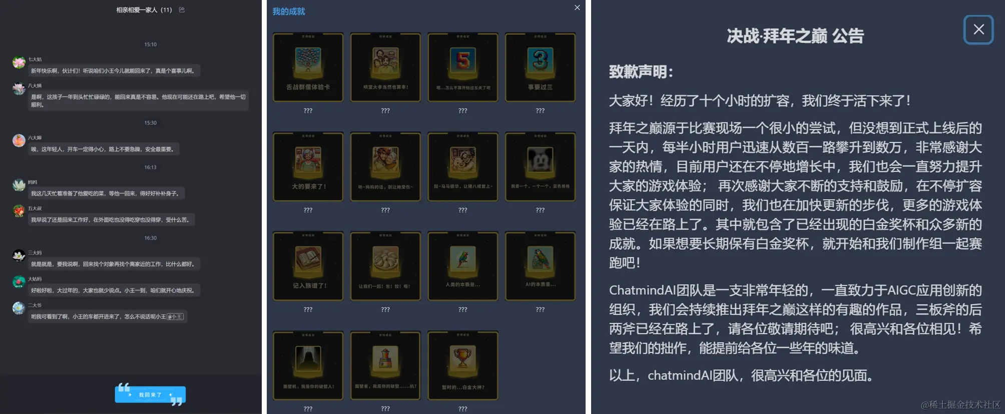 游戏界面以熟悉的「相亲相爱一家人」微信群开局,玩家需要舌战群雄,以高情商对话满足每一位亲戚的情绪值。每有一名亲戚情绪值拉满,玩家就可以点亮相应的成就图标 (o゜▽゜)o☆