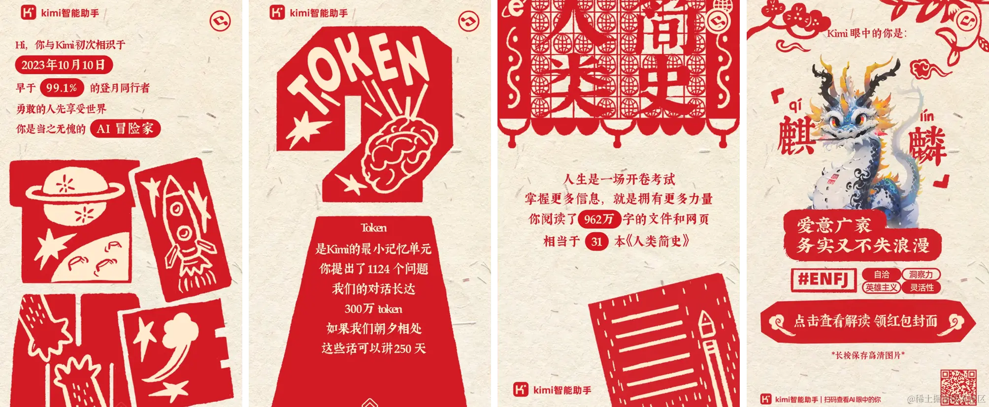 年尾各家公司的庆祝活动里,月之暗面 (Moonshot AI) 应该是最破圈 & 令人印象深刻的吧!不仅根据对话历史,进行了年度总结报告,还比较准确地预测了每位用户地 MBTI 性格分类~ 红包封面设计也很不错!!