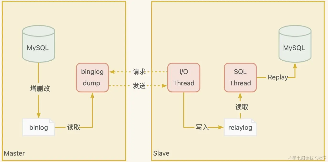 binglog dump线程将binlog文件数据发送到从库服务;从库服务通过一个 I/O 线程将接收到的数据写入relaylog二进制文件,最后从库服务将relaylog的数据重放(Replay)完成数据同步。
