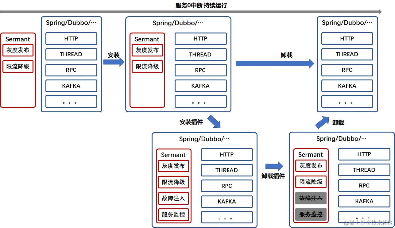 下图为Sermant的热插拔能力的示意图,在初始状态可以通过动态挂载Agent的能力安装字节码增强框架,然后可以通过动态挂载/卸载插件的能力在运行态增减所需服务治理能力,也可以直接将整个Agent进行卸载。