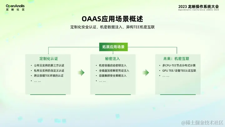 最后就是在未来随着机密计算应用规模增大,OAAS 可以作为异构 TEE 节点分布式互联场景下起到信任派发中心的作用,从而支持基于 OAAS 的异构 TEE 机密互联。