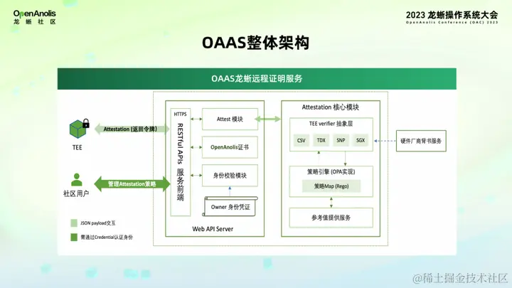 首先上图是 OAAS 实例在服务侧的一个整体的模块架构图。大家可以看到在实现上,我们把服务实例从内部划分为两个大的模块群,左边是 Web API Server,负责处理一些前端的业务逻辑,而右边是 Attestation 核心,负责执行真正涉及信任的证明验证逻辑。这样的划分有助于在部署的时候采取不同的安全保护级别。